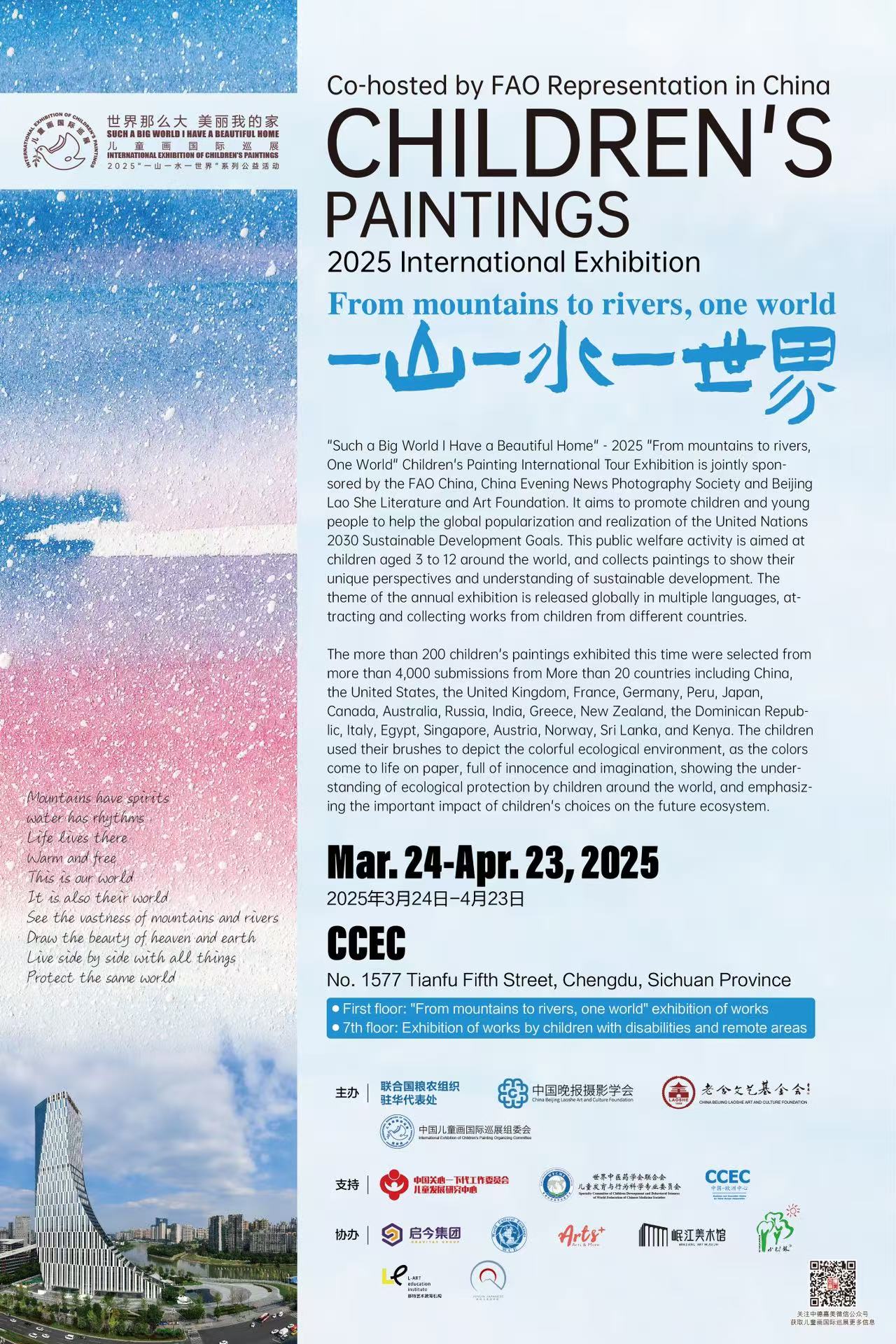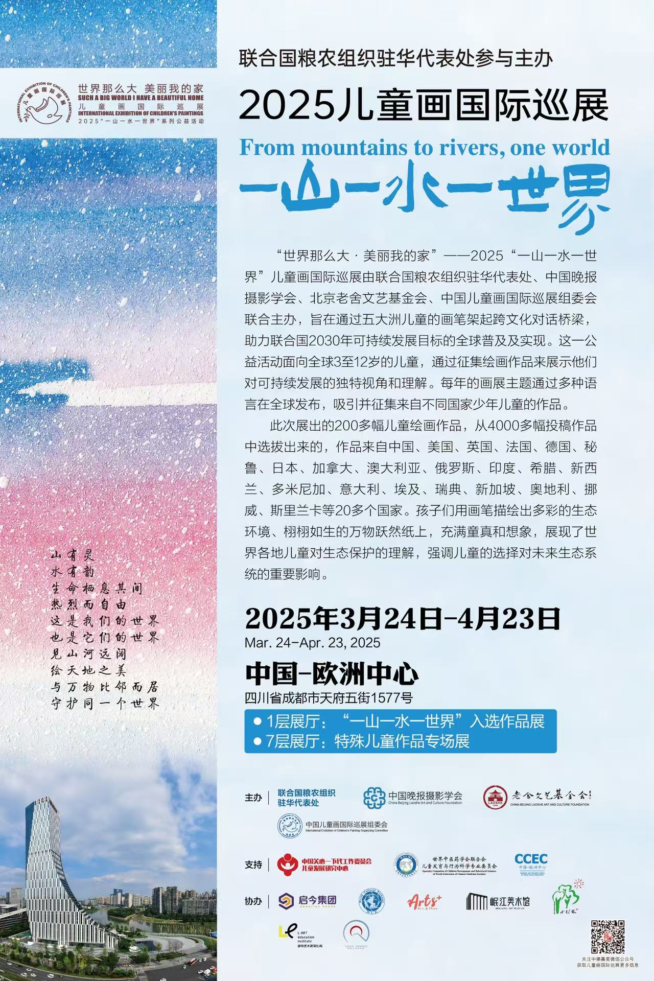 家教場地2025年3月24日-4月23日,在成都中歐中心1層展區,將迎來為期一個月的2025“一山一水一世界”兒童畫國際巡展,該展覽由聯合國糧農組織駐華代表處、中國晚報攝影學會、北京老舍文藝基金會、中國兒童畫國際巡展組委會聯合主分享辦,讓我們通過兒童的視野感受山水自然,讓我們通過兒童的畫筆看見色彩斑斕。